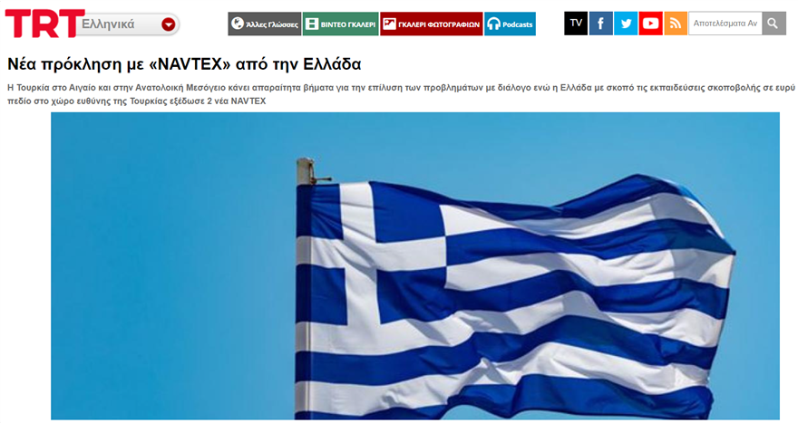 Στο ίδιο μήκος κύματος και το TRT, που στην ελληνική του έκδοση έχει τίτλο : «Νέα πρόκληση με «NAVTEX» από την Ελλάδα», επιχειρώντας να παρουσιάσει την Τουρκία ως τη πλευρά που αδικείται από τις ενέργειες της Ελλάδας στην Ανατολική Μεσόγειο. «Η Τουρκία στο Αιγαίο και στην Ανατολική Μεσόγειο κάνει τ’ απαραίτητα βήματα για την επίλυση των προβλημάτων με διάλογο, ενώ η Ελλάδα με σκοπό τις εκπαιδεύσεις σκοποβολής σε ευρύ πεδίο στο χώρο ευθύνης της Τουρκίας εξέδωσε 2 νέα NAVTEX. Η Τουρκία έπειτα από αυτή την εξέλιξη εντός του χώρου ευθύνης της για τις σχετικές περιοχές εξέδωσε νέα NAVTEX» αναφέρει το μεταξύ άλλων το δημοσίευμα.