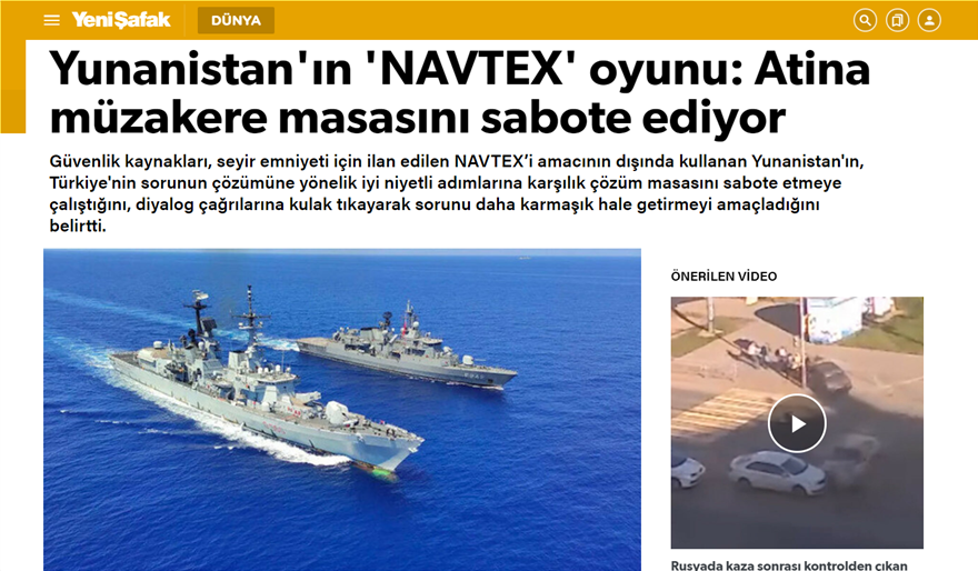 «Το παιχνίδι της Ελλάδας «NAVTEX»: Η Αθήνα σαμποτάρει το τραπέζι των διαπραγματεύσεων» είναι ο τίτλος δημοσιεύματος της ηλεκτρονικής έκδοσης της φιλοκυβερνητικής εφημερίδας Γενί Σαφάκ, που υποστηρίζει προκλητικά πως η Ελλάδα χρησιμοποιεί το θέμα έκδοσης Navtex, που αφορά την ασφάλεια της πλοήγησης, για να σαμποτάρει τις προσπάθειες για διμερή διάλογο με στόχο να γίνει αυτός ακόμη πιο περίπλοκος.