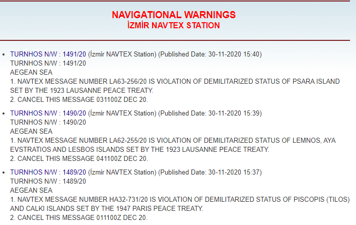 Η Τουρκία λοιπόν, εξέδωσε τρεις αντι-NAVTEX, θέτοντας ξανά ζήτημα αποστρατιωτικοποίησης για τα νησιά: ΨΑΡΑ-ΛΗΜΝΟΣ-ΑΓΙΟΣ ΕΥΣΤΡΑΤΙΟΣ-ΛΕΣΒΟΣ-ΧΑΛΚΗ-ΤΗΛΟΣ