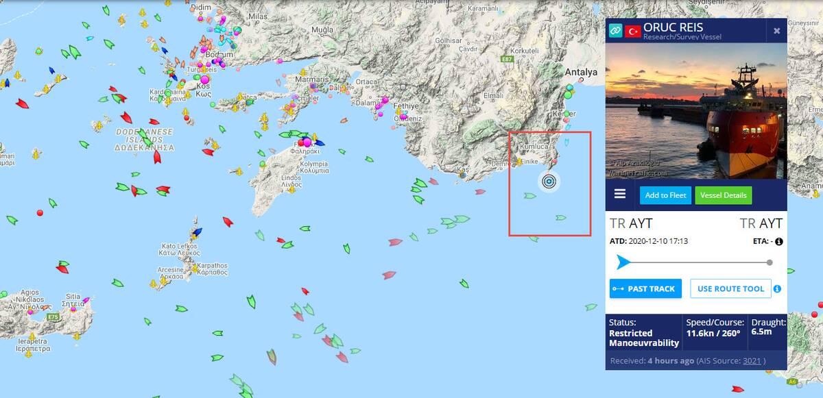Το Oruc Reis πλέει τις τελευταίες ώρες με κλειστό δέκτη, με αποτέλεσμα να μην είναι δυνατό να ανιχνευθεί από τo σύστημα AIS (Αυτόματο Σύστημα Αναγνωρίσεως).