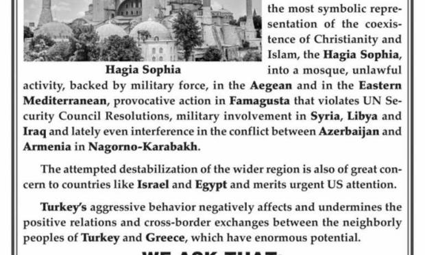 Την στήριξη των ΗΠΑ στα ελληνοτουρκικά ζητήματα ζητούν ομογενείς επιχειρηματίες, με ολοσέλιδη καταχώρισή τους στους «New York Times». Οι πέντε επιχειρηματίες καλούν την αμερικανική κυβέρνηση να αναλάβει δράση και να μην επιτρέψει στην Τουρκία να κλιμακώσει την ένταση στην Ανατολική Μεσόγειο και τις προκλήσεις κατά της Ελλάδας.