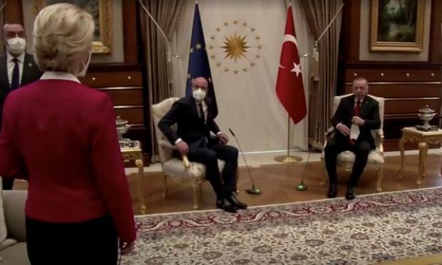 Το βίντεο από τη συνάντηση στην Άγκυρα δείχνει την φον ντερ Λάιεν να στέκει αμήχανη, την ώρα που ο τούρκος πρόεδρος και ο αξιωματούχος της ΕΕ κάθονται στις μοναδικές θέσεις που είναι τοποθετημένες μπροστά από τις σημαίες.