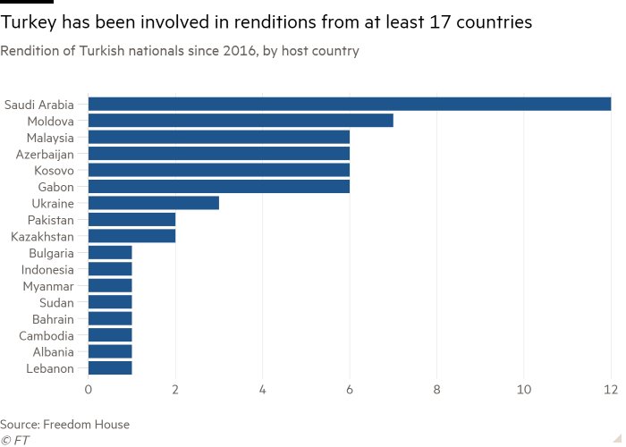 Το μυστήριο ταξίδι του -που θυμίζει τις εξαιρετικά αμφιλεγόμενες κατ’ εξαίρεση παραδόσεις που έκανε η CIA μετά τις τρομοκρατικές επιθέσεις της 11ης Σεπτεμβρίου- είναι το τελευταίο σε μια σειρά περιστατικών έκδοσης Τούρκων πολιτών από τα Βαλκάνια και άλλες χώρες που εξαρτώνται από την Άγκυρα για οικονομική, πολιτική ή ανθρωπιστική στήριξη.