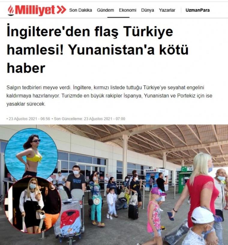 «Η Αγγλία, η τρίτη στη λίστα χωρών απ΄ όπου προέρχονται οι περισσότεροι τουρίστες στη χώρα μας πριν από την πανδημία. ετοιμάζεται ν’ άρει την ταξιδιωτική απαγόρευση» αναφέρει το δημοσίευμα, τονίζοντας πως: «Οι απαγορεύσεις θα συνεχιστούν για τους μεγαλύτερους ανταγωνιστές της Τουρκίας στον τουρισμό, την Ελλάδα, την Ισπανία και την Πορτογαλία».