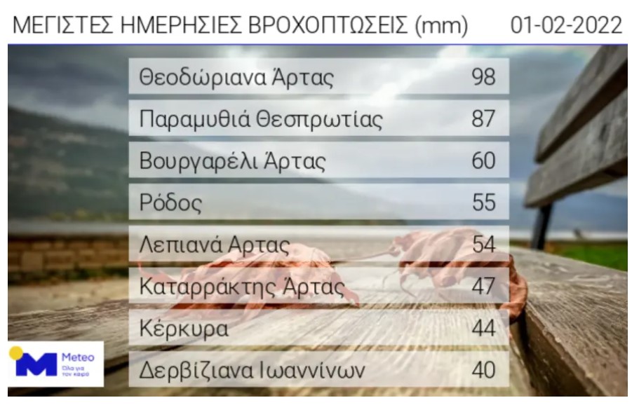 Μεγάλα ύψη βροχής καταγράφηκαν στα δυτικά τμήματα της χώρας, στη Θράκη και στα ανατολικά τμήματα του Αιγαίου έως το απόγευμα της Τρίτης 01/02. Ο πίνακας που ακολουθεί παρουσιάζει τα μεγαλύτερα αθροιστικά ύψη υετού που κατέγραψαν οι αυτόματοι μετεωρολογικοί σταθμοί του δικτύου του Εθνικού Αστεροσκοπείου Αθηνών / meteo.gr. Όπως φαίνεται σε αυτόν, η μεγαλύτερη ποσότητα βροχής έπεσε στα Θεοδώριανα Άρτας και ήταν ίση με 98 χιλιοστά.