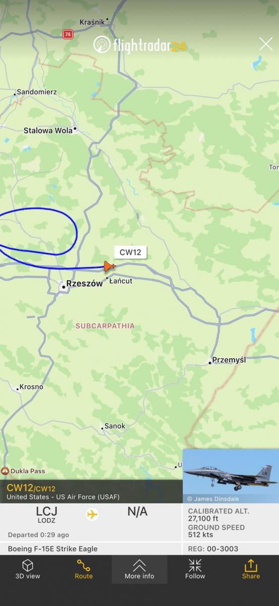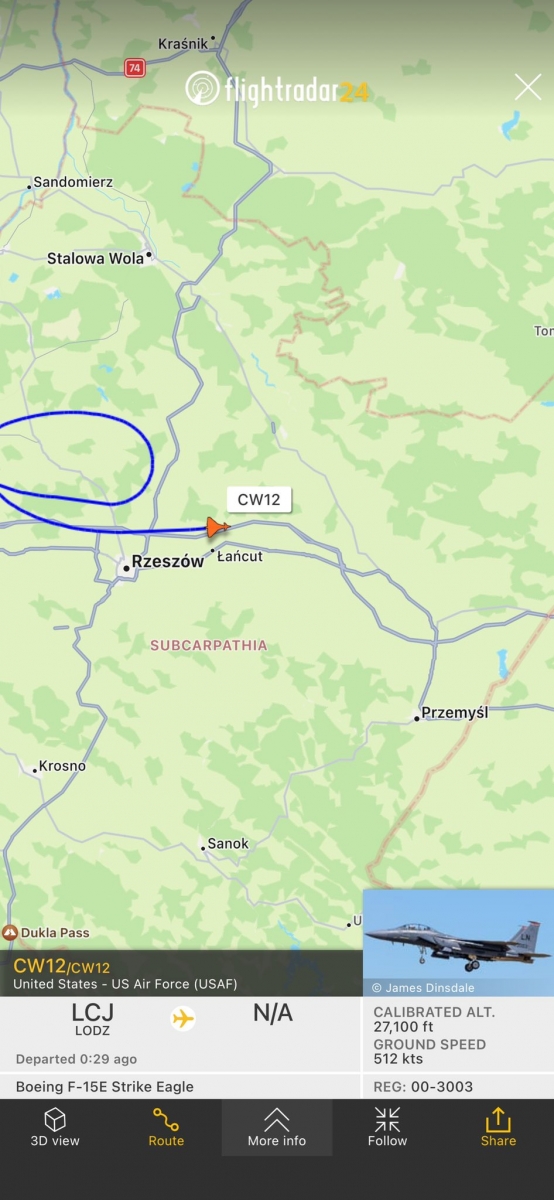Σύμφωνα με τα στοιχεία που παρουσιάστηκαν, μια ομάδα μαχητικών της Πολεμικής Αεροπορίας των ΗΠΑ πέταξε αρχικά στην περιοχή της πόλης Rzeszow, η οποία έγινε κέντρο επιμελητείας για τη μεταφορά όπλων του ΝΑΤΟ στην Ουκρανία. Αρχικά, θεωρήθηκε ότι το αεροσκάφος θα μπορούσε να συνοδεύσει αεροσκάφη με μια νέα παρτίδα όπλων για τις Ένοπλες Δυνάμεις της Ουκρανίας, αλλά μέχρι στιγμής δεν έχει καταστεί