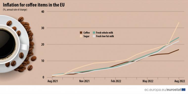 Τα στοιχεία για τον Αύγουστο του 2022 δείχνουν ότι η τιμή του καφέ στην ΕΕ ήταν κατά μέσο όρο 16,9% υψηλότερη από τον Αύγουστο του 2021, ενώ τον Αύγουστο του 2021 η τιμή του καφέ στην ΕΕ ήταν κατά μέσο όρο 0,5% υψηλότερη από τον Αύγουστο του 2020, σύμφωνα με την Ευρωπαϊκή Στατιστική Υπηρεσία (Eurostat) .
