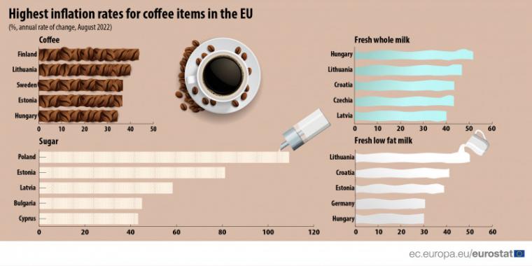 Όσον αφορά την τιμή του καφέ, οι μεγαλύτερες αυξήσεις τον Αύγουστο του 2022 σημειώθηκαν στη Φινλανδία (43,6%), στη Λιθουανία (39,9%), στη Σουηδία (36,7%), στην Εσθονία (36,4%) και στην Ουγγαρία (34,3%).