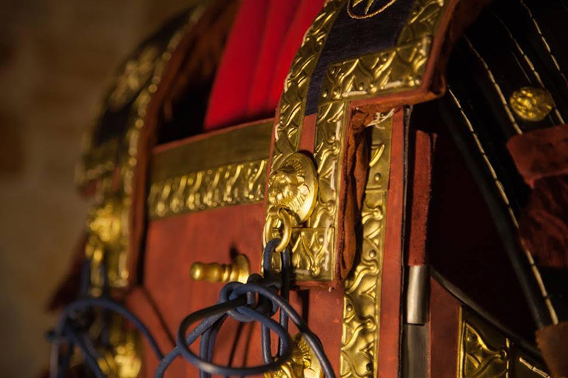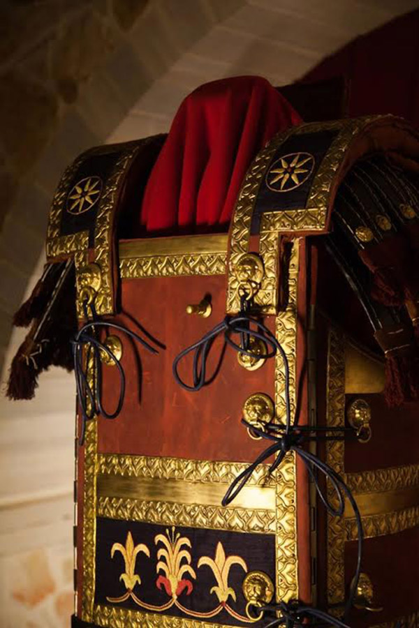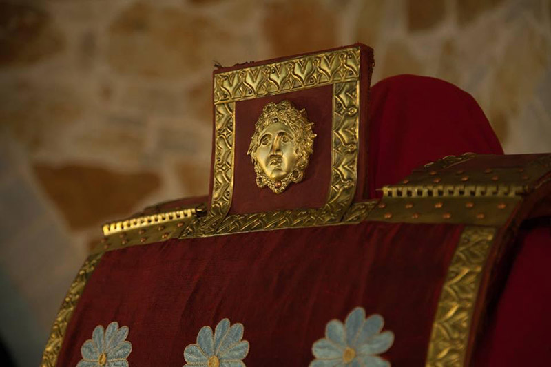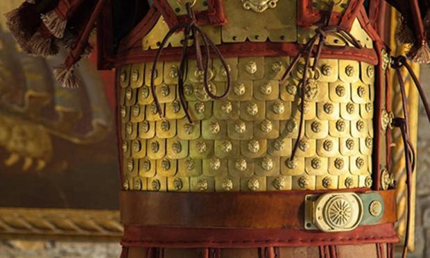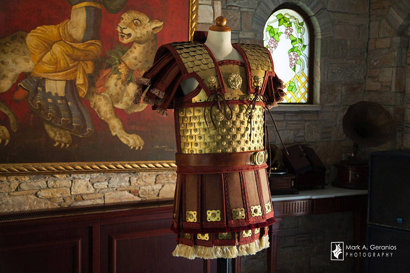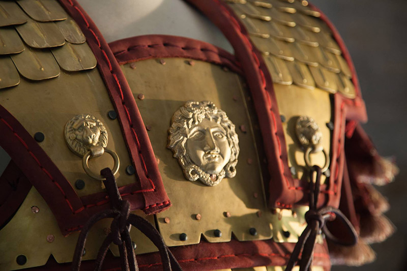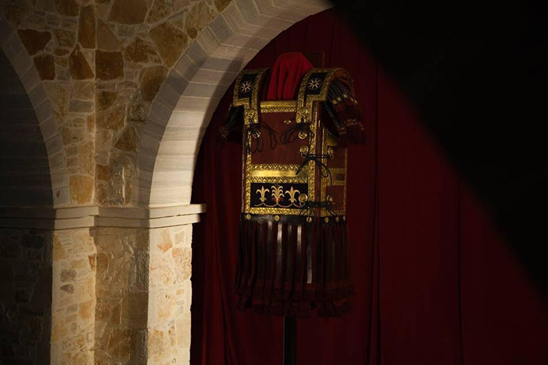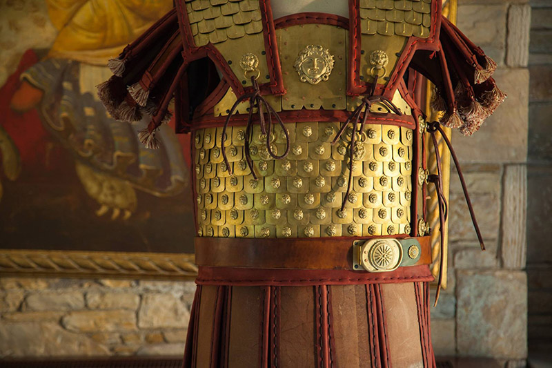 Αντίγραφο σε φυσικό μέγεθος της πανοπλίας του Φιλίππου όπως αυτή εκτείθεται στο Μουσείο των Βασιλικών Τάφων στην Βεργίνα. Η αποκατάσταση των οργανικών μερών έχει βασιστεί σε καλλιτεχνικά μοτίβα προερχόμενα από τον διάκοσμο της Λάρνακας του Φιλίππου.