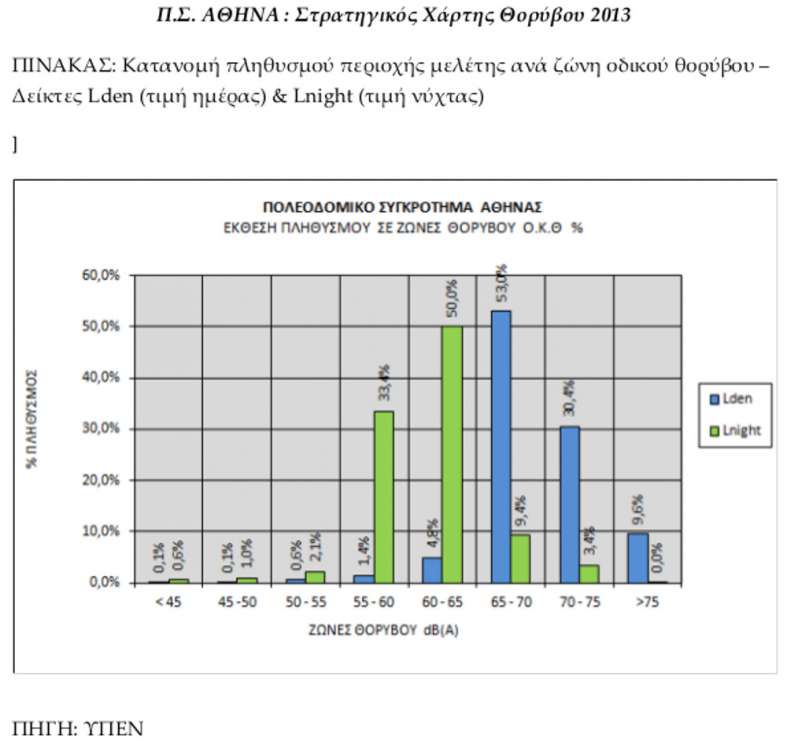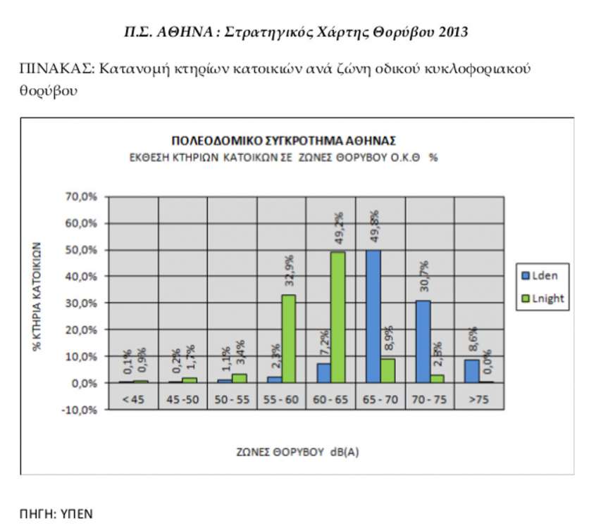 Πάντως, ως χώρα, ακολουθήσαμε την επιταγή της ευρωπαϊκής οδηγίας, περί καταρτίσεως Στρατηγικών Χαρτών Θορύβου. Μόνο που ο τελευταίος τέτοιος Χάρτης, που αναρτήθηκε και στην ηλεκτρονική σελίδα του υπουργείου Περιβάλλοντος, ήταν του 2013… Σύμφωνα με αυτόν, περισσότεροι από τους μισούς Αθηναίους (53%), που ζουν ή μετακινούνται στο Κέντρο της Αθήνας (στο οποίο, κατά τη μέτρηση, εντάσσονται οι δήμοι Αθηναίων και Φιλοθέης-Ψυχικού) υφίστανται την ημέρα τιμές θορύβου 65-70 dB! Σημειώνεται ότι μόλις 0,1% του πληθυσμού του κέντρου της Αθήνας έχει την πολυτέλεια να ζει σε ιδανικές συνθήκες ήχου (κάτω από 45 dΒ).