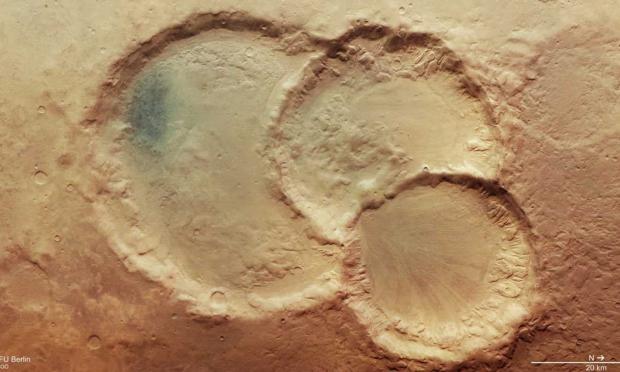 Το σκάφος Mars Express του Ευρωπαϊκού Οργανισμού Διαστήματος (ESA), το οποίο βρίσκεται σε τροχιά γύρω από τον πλανήτη Άρη εδώ και χρόνια, ανακάλυψε ένα εντυπωσιακό ασυνήθιστο τριπλό κρατήρα. Στην πραγματικότητα πρόκειται για τρεις κρατήρες που εν μέρει αλληλεπικαλύπτονται.