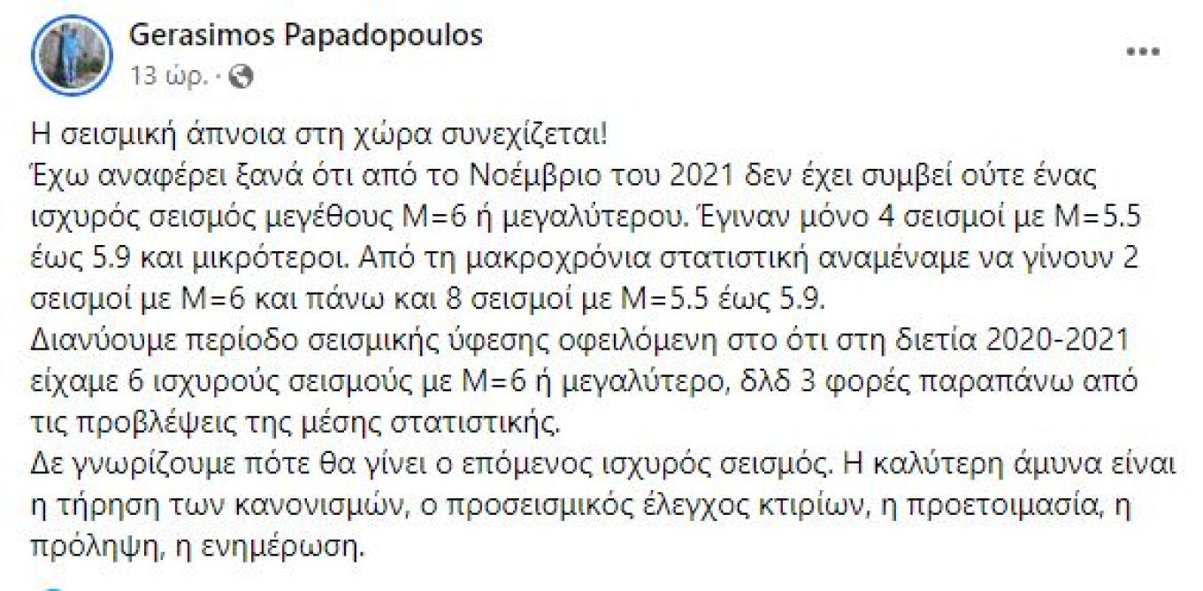 Ο Γεράσιμος Παπαδόπουλος σημείωνει στην ανάρτησή του ότι στο διάστημα αυτό έχουν σημειωθεί μόνο τέσσερις σεισμοί από 5,5 έως 5,9 Ρίχτερ ενώ, όπως σημειώνει, «από τη μακροχρόνια στατιστική αναμέναμε να γίνουν 2 σεισμοί με Μ=6 και πάνω και 8 σεισμοί με Μ=5.5 έως 5.9».