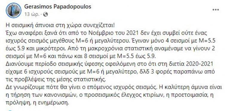 Ανάρτηση για το γεγονός ότι δεν έχουν καταγραφεί μεγάλοι σεισμοί από τον Νοέμβριο του 2021 έκανε ο σεισμολόγος Γεράσιμος Παπαδόπουλος κάνοντας λόγο για «σεισμική άπνοια στη χώρα που συνεχίζεται».
