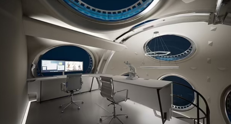 Οι εικόνες από το σχέδιο του υποβρυχίου, αποκαλύπτουν πώς θα διαθέτει μια κεντρική «μεγάλη αίθουσα», με εργαστήρια σε έναν ημιώροφο πάνω από αυτήν.