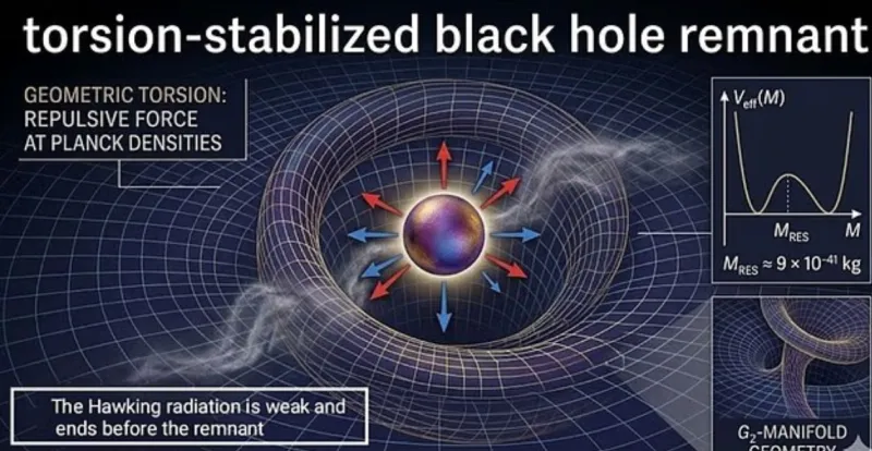 Σε αυτό το διευρυμένο, επταδιάστατο μοντέλο, ο χωροχρόνος δεν καμπυλώνεται απλώς υπό το βάρος της βαρύτητας, αλλά υφίσταται και το φαινόμενο της στρέψης (torsion). Καθώς μια μαύρη τρύπα οδεύει προς την εξάτμιση, οι επτά διαστάσεις της περιπλέκονται, σχηματίζοντας έναν στέρεο «κόμπο». Η προοδευτική σμίκρυνση αυτού του κόμβου ενεργοποιεί δυνάμεις προερχόμενες από τις κρυφές διαστάσεις, οι οποίες αναχαιτίζουν την πλήρη κατάρρευση του σώματος.