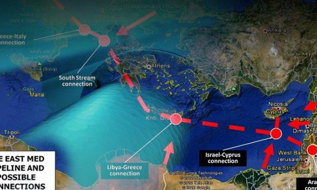 Ο αγωγός 2,200 χλμ. EAST MED θα ρέει μέσω αγωγών από το Ισραήλ στην Κύπρο , την Ελλάδα και την Ιταλίας στην καρδιά της Ευρώπης .