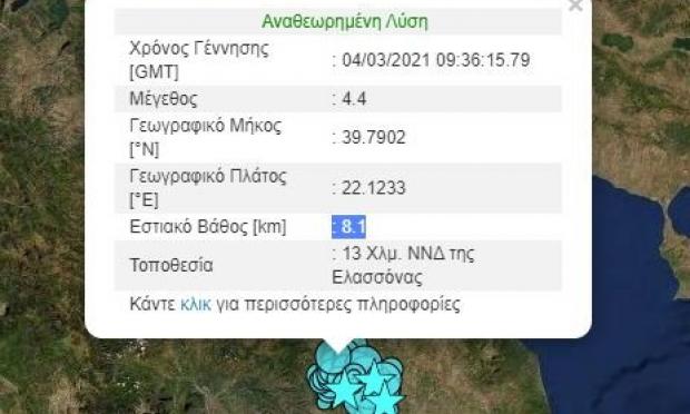 Ο σεισμός είχε μέγεθος 4,4 Ρίχτερ σύμφωνα με το Γεωδυναμικό και 4,7 σύμφωνα με το Ευρωμεσογειακό Ινστιτούτο, ενώ το επίκεντρο εντοπίστηκε 13 χλμ. νότια νοτιοδυτικά της Ελασσόνας και το εστιακό βάθος υπολογίστηκε στα 8,1 χλμ.