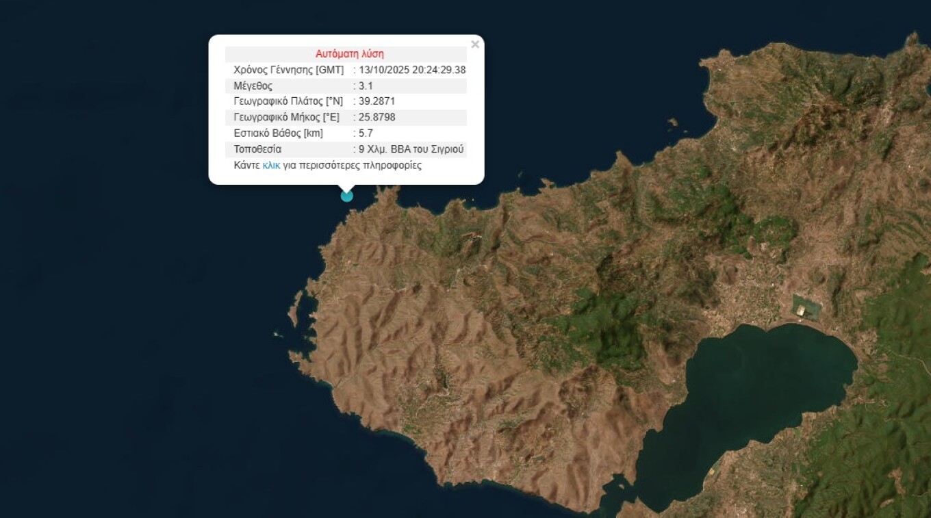 Σύμφωνα με την αυτόματη λύση του το Γεωδυναμικού Ινστιτούτου αναφέρει ότι επίκεντρο ήταν 9 χλμ. βόρεια-βορειοανατολικά του Σιγριού.