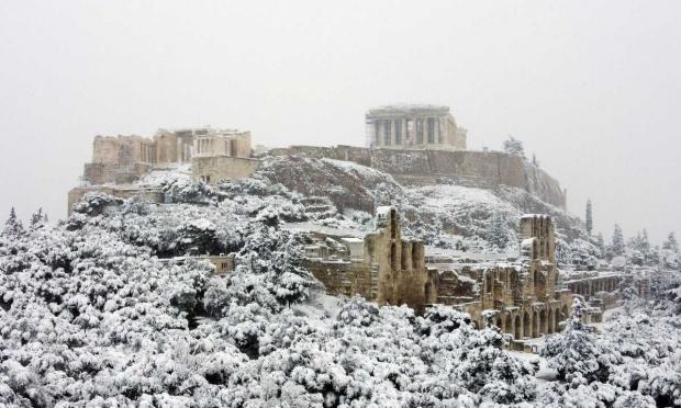 Στα λευκά "ντύθηκαν" και η Πλάκα και η Διονυσίου Αρεοπαγίτου, με τις εικόνες να μοιάζουν σαν να είναι βγαλμένες από παραμύθι...