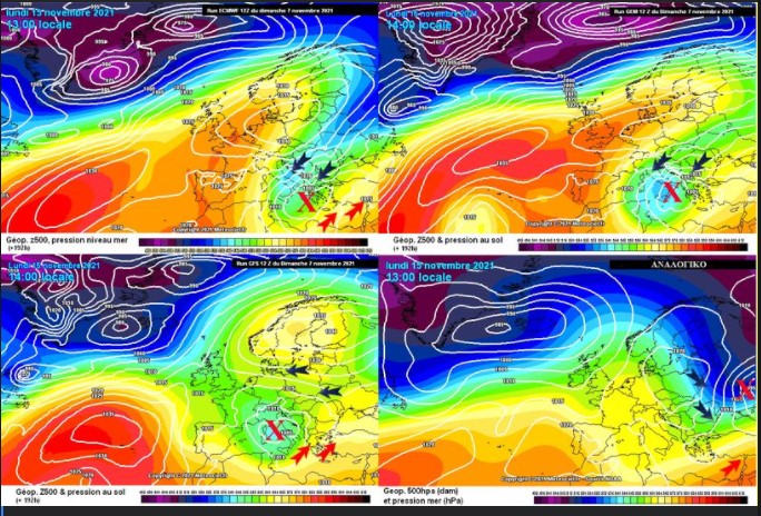 «Για παράδειγμα το ευρωπαϊκό μοντέλο (ΕCMWF), πάνω αριστερά για τις 15 Νοεμβρίου προβλέπει τη δημιουργία ενός βαρομετρικού χαμηλού (X) σχεδόν πάνω από την Ελλάδα και κάθοδο αρκετά ψυχρών- χειμωνιάτικου τύπου- αέριων μαζών (μπλε βέλη) κυρίως όμως για τα κεντρικά και τα βόρεια τμήματα της χώρας. Παρόμοια εικόνα δείχνει και το καναδικό προγνωστικό μοντέλο (GEM) πάνω δεξιά . Αντίθετα το Αμερικανικό μοντέλο (GFS), κάτω αριστερά, προβλέπει τη δημιουργία βαρομετρικού χαμηλού (X) πολύ πιο δυτικά από την Ελλάδα και θερμότερες – ανοιξιάτικες αέριες μάζες (κόκκινα βέλη) πάνω από τη χώρα μας».