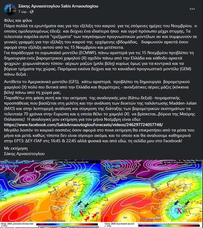 Συγκεκριμένα, σύμφωνα με ανάρτηση που έκανε στο Facebook, ο Σάκης Αρναούτογλου, τα παγκόσμια προγνωστικά μοντέλα «αν και συμφωνούν σε γενικές γραμμές για την εξέλιξη του καιρού της ερχόμενης εβδομάδας, διαφωνούν αρκετά όσον αφορά στην εξέλιξη αυτού από τις 15 Νοεμβρίου και μετέπειτα».
