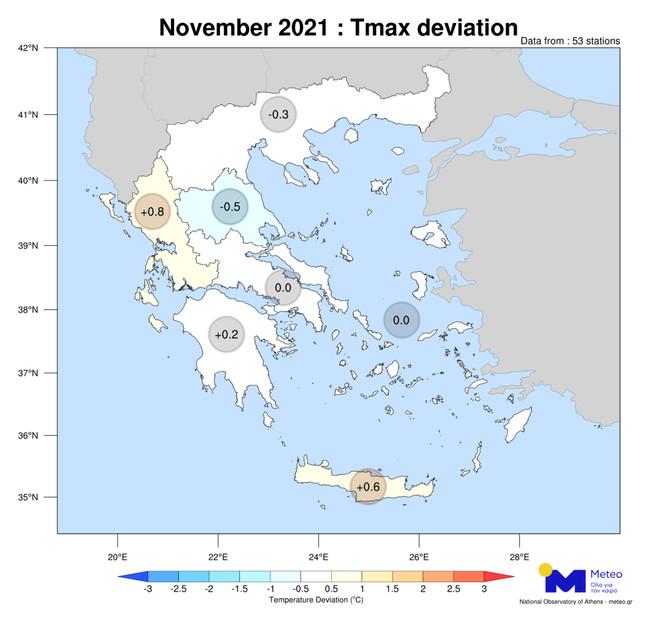 Αρχικά, τις μεγαλύτερες θετικές αποκλίσεις κατέγραψαν οι μετεωρολογικοί σταθμοί στην Ήπειρο (Ιωάννινα) και στη Μακεδονία (Φλώρινα και Πολύγυρος), όπου η μέγιστη θερμοκρασία στις 5 και 6 Νοεμβρίου κυμάνθηκε έως και 11 βαθμούς Κελσίου πάνω από τα φυσιολογικά για την εποχή επίπεδα. Αργότερα, στο δεύτερο και στην αρχή του τρίτου δεκαημέρου του μήνα, η μέγιστη θερμοκρασία ήταν ελαφρώς χαμηλότερη από τον μέσο όρο της περιόδου 2010-2019 και στους 53 μετεωρολογικούς σταθμούς.