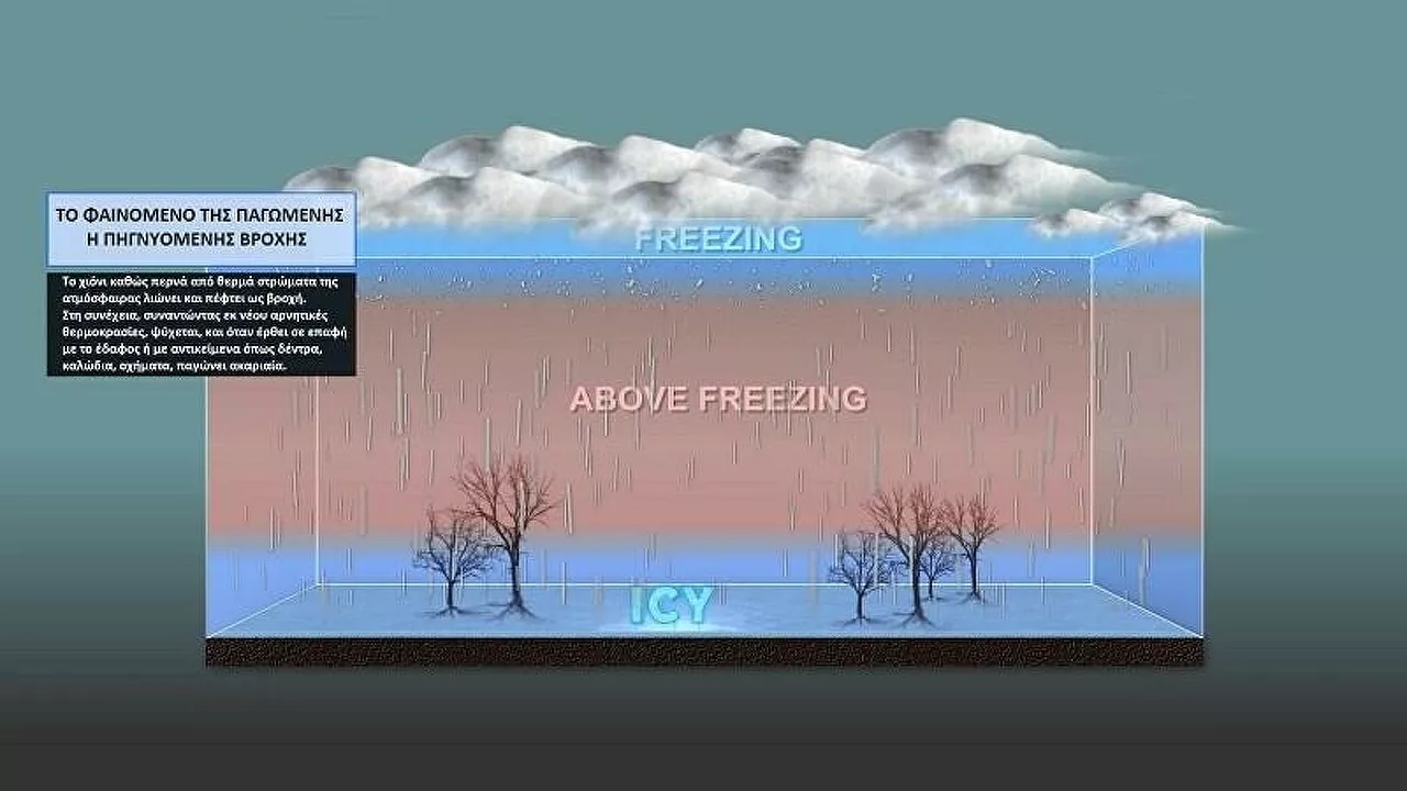 Το χιόνι λιώνει καθώς περνά στα θερμά στρώματα της ατμόσφαιρας και μόλις συναντήσει αρνητικές θερμοκρασίες στο έδαφος, δένδρα καλώδια, οχήματα ή κάθε άλλου είδους επιφάνεια ψύχεται και μετατρέπεται σε πάγο.