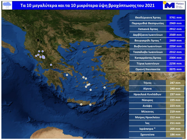 Στο χάρτη που ακολουθεί παρουσιάζονται τα 10 μεγαλύτερα και τα 10 μικρότερα ετήσια ύψη βροχόπτωσης για το 2021. Με αστερίσκους επισημαίνονται σταθμοί στους οποίους έχει διαπιστωθεί έλλειψη δεδομένων βροχόπτωσης και ως εκ τούτου οι καταγραφές υστερούν των πραγματικών.