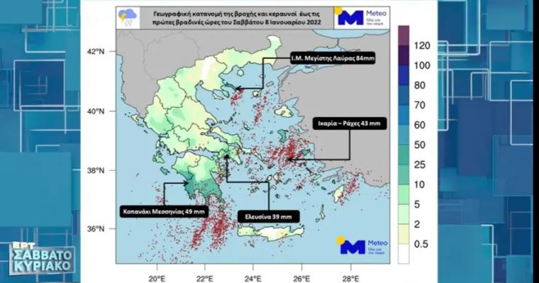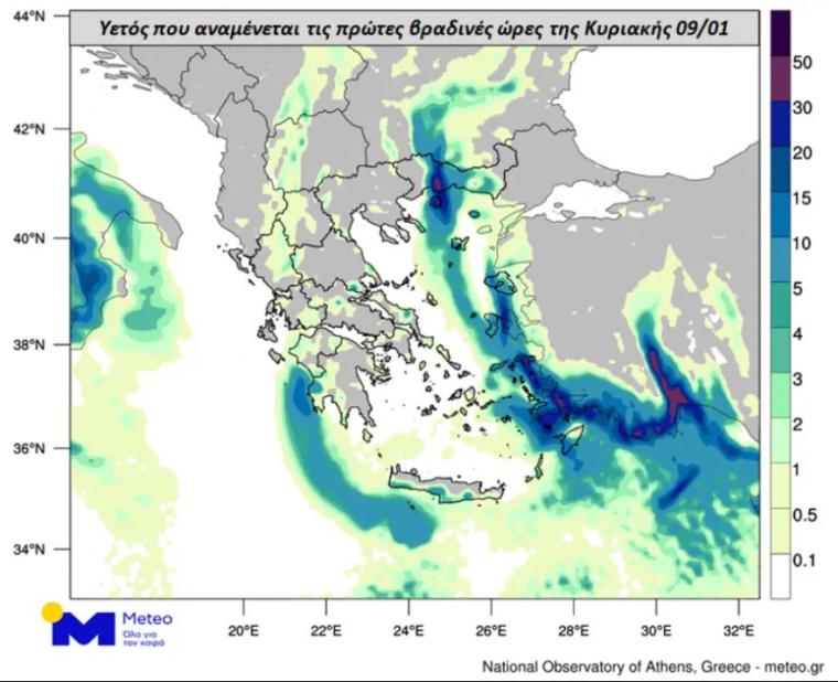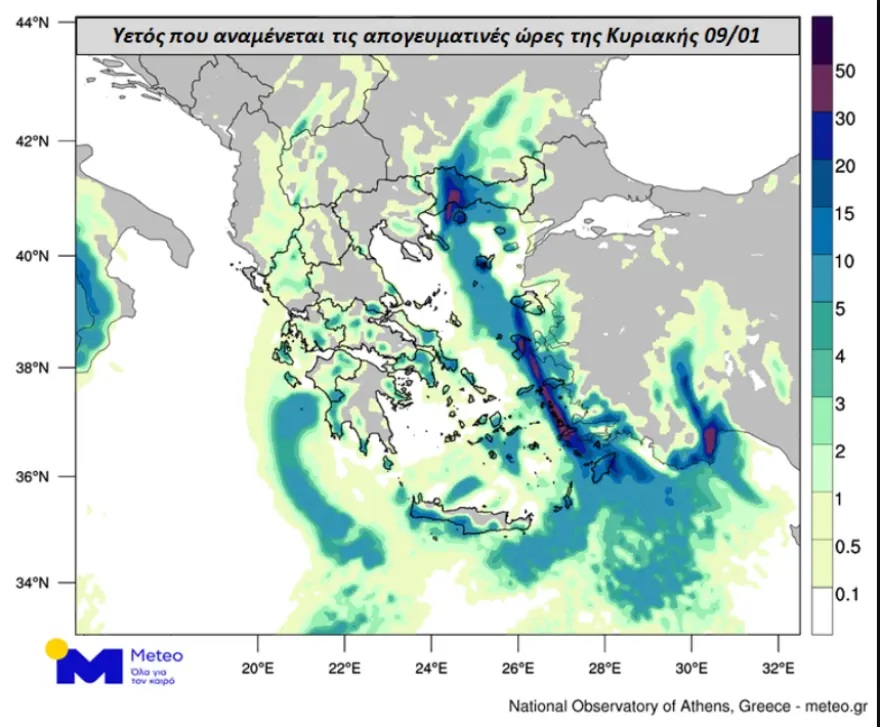 Οι συγκεντρώσεις σκόνης στην ατμόσφαιρα θα είναι σχετικά αυξημένες και θα σημειωθούν λασποβροχές. Στους χάρτες που ακολουθούν παρουσιάζεται ο υετός (βροχή/χαλάζι) που αναμένεται τις απογευματινές (επάνω) και τις πρώτες βραδινές ώρες (κάτω) της Κυριακής 09/01.