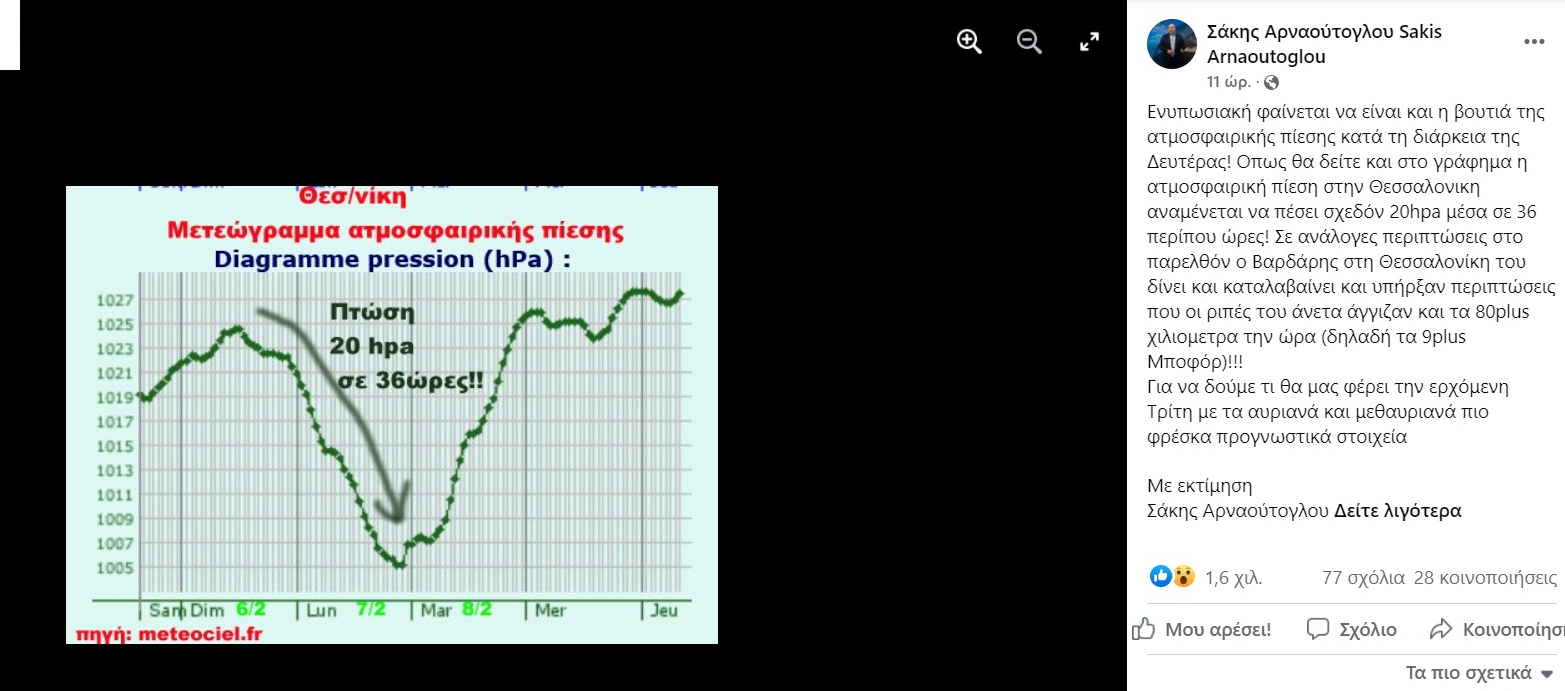 Σε άλλη ανάρτηση ο Σάκης Αρανούτογλου αναφέρει: «Ενυπωσιακή φαίνεται να είναι και η βουτιά της ατμοσφαιρικής πίεσης κατά τη διάρκεια της Δευτέρας! Οπως θα δείτε και στο γράφημα η ατμοσφαιρική πίεση στην Θεσσαλονικη αναμένεται να πέσει σχεδόν 20hpa μέσα σε 36 περίπου ώρες! Σε ανάλογες περιπτώσεις στο παρελθόν ο Βαρδάρης στη Θεσσαλονίκη του δίνει και καταλαβαίνει και υπήρξαν περιπτώσεις που οι ριπές του άνετα άγγιζαν και τα 80plus χιλιομετρα την ώρα (δηλαδή τα 9plus Μποφόρ)!!!