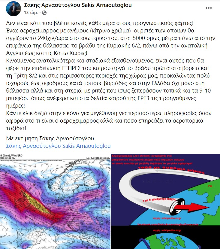 Ειδικότερα αναφέρει σε ανάρτησή του: «Δεν είναι κάτι που βλέπει κανείς κάθε μέρα στους προγνωστικούς χάρτες! Ένας αεροχείμαρρος με ανέμους (κίτρινο χρώμα) οι ριπές των οποίων θα αγγίζουν τα 240χιλ/ώρα στο εσωτερικό του, στα 5000 όμως μέτρα πάνω από την επιφάνεια της θάλασσας, το βράδυ της Κυριακής 6/2, πάνω από την ανατολική Αγγλια έως και τις Κάτω Χώρες!