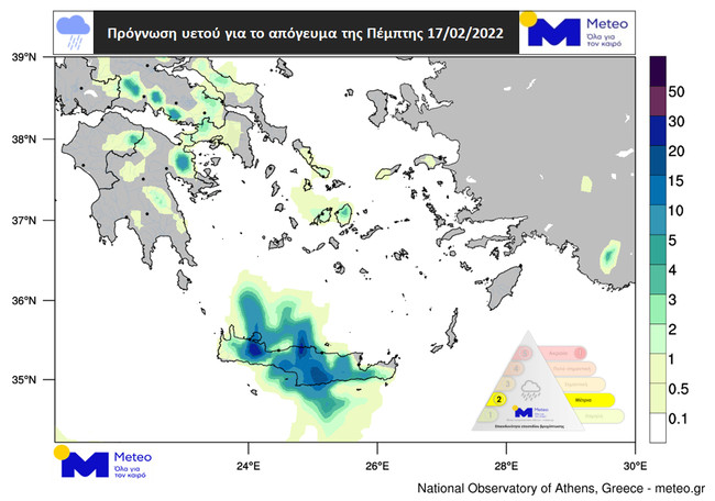 Σύμφωνα με το meteo.gr, για το υπόλοιπο της Πέμπτης 17/02 βροχοπτώσεις θα εκδηλωθούν κυρίως στα νότια τμήματα της χώρας και πιο συγκεκριμένα στη Στερεά Ελλάδα, στην Πελοπόννησο, στις Κυκλάδες και στην Κρήτη.