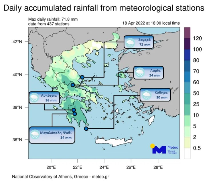Στον παρακάτω Χάρτη απεικονίζονται με χρωματική κλίμακα τα ημερήσια ύψη βροχής έως τις απογευματινές ώρες της Μεγάλης Δευτέρας 18/04 (διάστημα 00:00 – 18:00), ενώ επισημαίνονται ενδεικτικά τα ύψη βροχόπτωσης πέντε περιοχών. Το μεγαλύτερος ύψος καταγράφηκε στη Ζαγόρα Πηλίου, φτάνοντας στα 72mm.