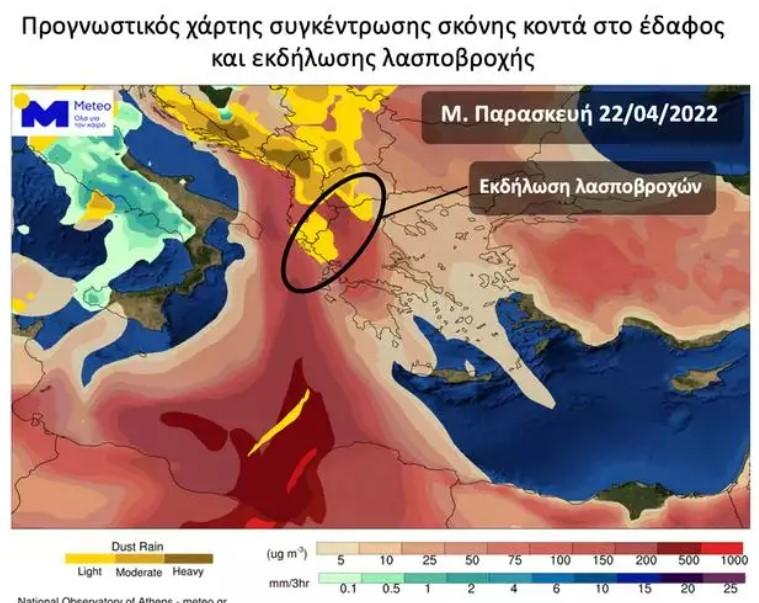 Αυτό έχει ως αποτέλεσμα την εκ νέου μεταφορά μεγάλης ποσότητας αφρικανικής σκόνης, ενώ η θερμοκρασία θα παρουσιάσει περαιτέρω άνοδο την Μ. Παρασκευή και το Μ. Σάββατο και θα ξεπεράσει τοπικά τους 25 βαθμούς Κελσίου.