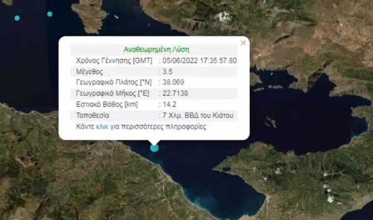 Σύμφωνα με το Γεωδυναμικό Ινστιτούτο του Εθνικού Αστεροσκοπείου Αθηνών, ο σεισμός στην Κόρινθο είχε μέγεθος 3,5 Ρίχτερ και το επίκεντρό του εντοπίζεται στον Κορινθιακό κόλπο, 7 χιλιόμετρα βόρεια βορειοανατολικά του Κιάτου.