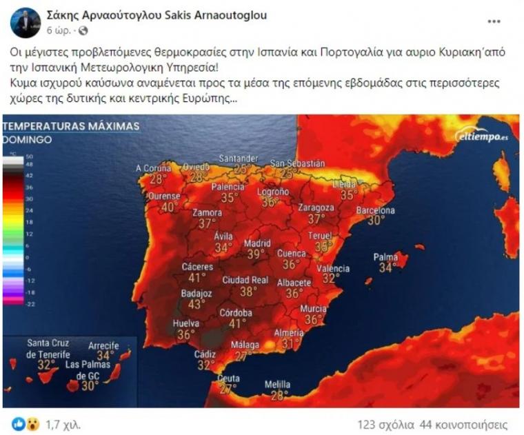 «Οι μέγιστες προβλεπόμενες θερμοκρασίες στην Ισπανία και Πορτογαλία για αύριο Κυριακή από την Ισπανική Μετεωρολογική Υπηρεσία!