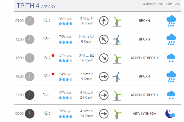 Σήμερα Τρίτη (04-04-2023) τοπικά ισχυρές βροχές και καταιγίδες προβλέπονται έως τις πρώτες απογευματινές ώρες στη Θράκη, στα νησιά του βόρειου και του ανατολικού Αιγαίου και στα Δωδεκάνησα. Σταδιακά τα φαινόμενα θα εξασθενήσουν.