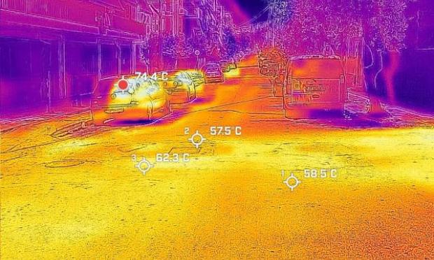 Ακόμα πιο υψηλές θερμοκρασίες «έπιασε» η θερμική κάμερα στην άσφαλτο και πάνω στα αυτοκίνητα. Χαρακτηριστικά, στο Facebook του EnternityGR δημοσιεύονται οι φωτογραφίες που είναι όλες είναι τραβηγμένες με θερμική κάμερα.