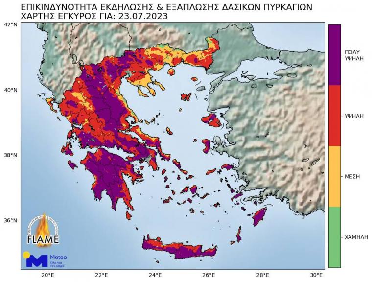 Παράλληλα, με βάση τα προγνωστικά στοιχεία της πυρομετεωρολογικής ομάδας FLAME του Εθνικού Αστεροσκοπείου Αθηνών (ΕΑΑ) / meteo.gr, εξαιρετικά δυσμενείς πυρομετεωρολογικές συνθήκες αναμένεται να επικρατήσουν σε μεγάλος μέρος της χώρας την Κυριακή 23/07, με έμφαση στα ανατολικά και νότια ηπειρωτικά τμήματα και το Αιγαίο όπου αναμένεται ακραίος κίνδυνος εκδήλωσης και εξάπλωσης δασικών πυρκαγιών.