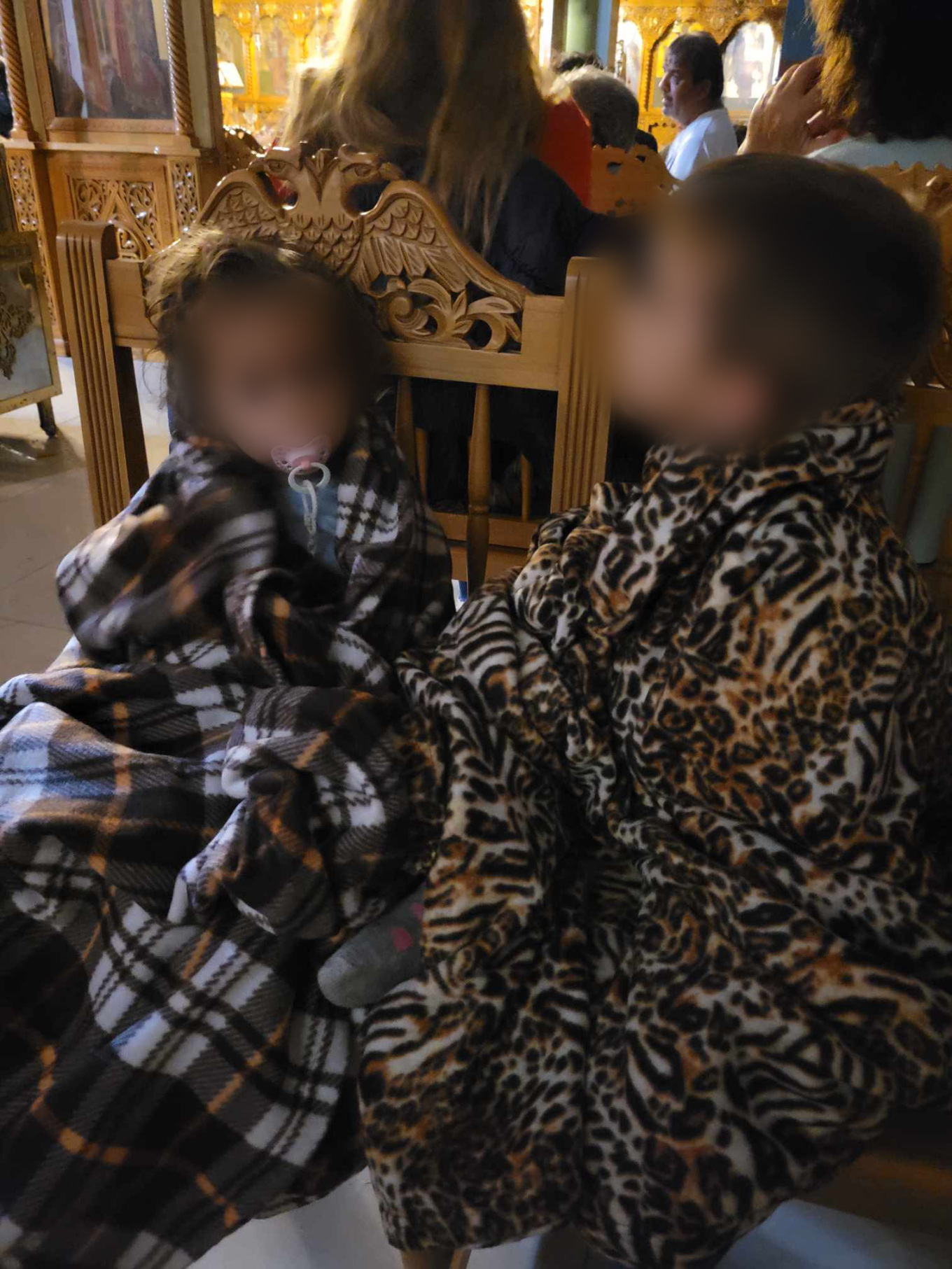Παιδάκια με κουβέρτες, στην εκκλησία στο χωριό Αρμένιο μετά την μεταφορά τους από το Σωτήριο.
