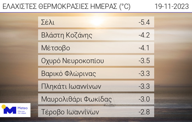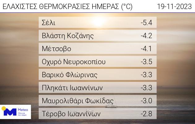 Στον πίνακα που ακολουθεί παρουσιάζονται οι 8 σταθμοί (εκτός χιονοδρομικών κέντρων) του δικτύου αυτόματων μετεωρολογικών σταθμών του Εθνικού Αστεροσκοπείου Αθηνών / meteo.gr που κατέγραψαν τις χαμηλότερες θερμοκρασίες.