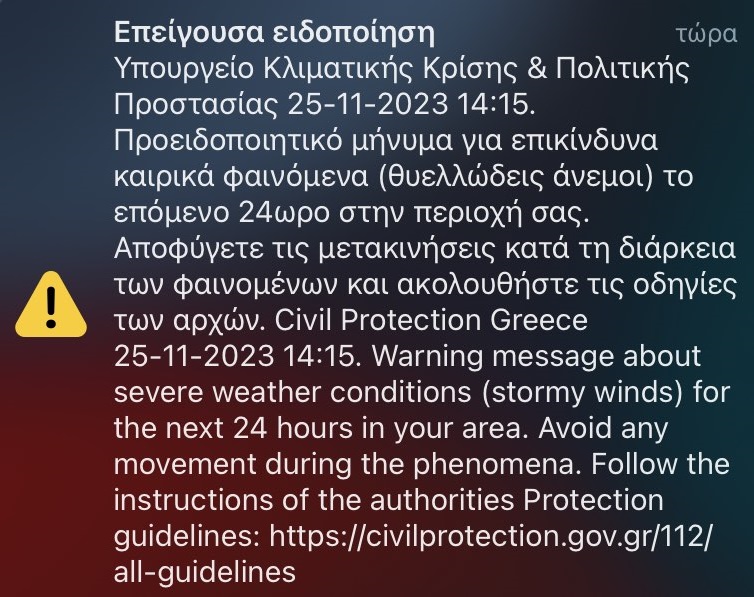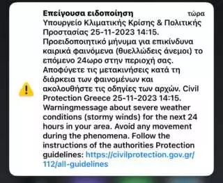 Συγκεκριμένα το μήνυμα αναφέρει: «Υπουργείο Κλιματικής Κρίσης & Πολιτικής Προστασίας 25-11-2023 14:15. Προειδοποιητικό μήνυμα για επικίνδυνα καιρικά φαινόμενα (θυελλώδεις άνεμοι) το επόμενο 24ωρο στην περιοχή σας. Αποφύγετε τις μετακινήσεις κατά τη διάρκεια των φαινομένων και ακολουθήστε τις οδηγίες των αρχών. Civil Protection Greece 25-11-2023 14:15».