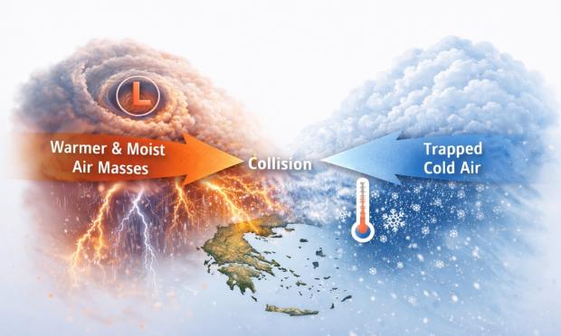 🌍 Θα υπάρχει ψυχρή, ξηρότερη αέρια μάζα κοντά στο έδαφος και στα χαμηλά στρώματα (κρύο υπόστρωμα), και από πάνω της θα αρχίσουν να εισβάλλουν θερμότερες και πολύ υγρές αέριες μάζες που συνοδεύουν το χαμηλό (υγρή τροφοδοσία).