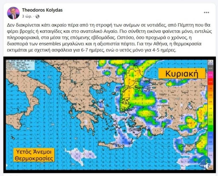 Σύμφωνα με την πρόγνωση του Θοδωρή Κολυδά, στα μέσα της επόμενης εβδομάδας η εικόνα φαίνεται πιο σύνθετη. Ωστόσο, όσο προχωρά ο χρόνος, η διασπορά των ensembles μεγαλώνει και η αξιοπιστία πέφτει.