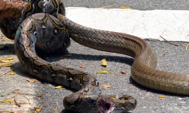 Μπροστά στην κάμερα, βασιλική κόμπρα και πύθωνας δίνουν μια επική μάχη επιβίωσης, σε δρόμο της Σιγκαπούρης