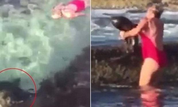 Την σκηνή κατέγραψε από την παραλία η κόρη της Hatheier με το κινητό της τηλέφωνο. Στο βίντεο η πραγματικά ατρόμητη Αυστραλή εμφανίζεται να πιάνει το επικίνδυνο ψάρι... αγκαλιά, να το σηκώνει και να το περνάει πάνω από τα βράχια, ελευθερώνοντάς το.
