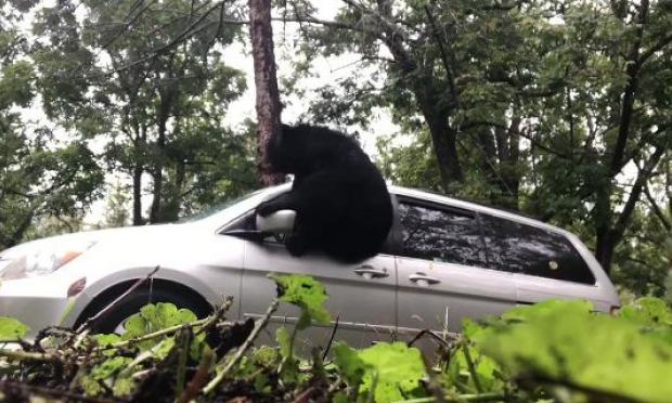 Εκείνη παραξενεύτηκε, αλλά δεν το πολυσκέφτηκε. Κλείδωσε την πόρτα και ξαναμπήκε στο σπίτι. Δεν μπορούσε να φανταστεί ότι μόλις είχε εγκλωβίσει μια αρκούδα μέσα στο όχημα! Περίπου μισή ώρα αργότερα, βγήκε ξανά για να πάρει κάτι από το αυτοκίνητο και παρατήρησε ότι τα τζάμια είχαν θολώσει και υπήρχαν πατημασιές ζώου.