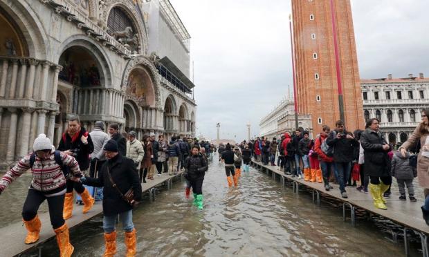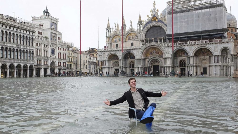 Στα πλάνα που μεταδίδουν τα τηλεοπτικά δίκτυα διακρίνονται άνθρωποι στη διάσημη πλατεία του Αγίου Μάρκου, να περπατούν με το νερό πάνω από το γόνατό τους.