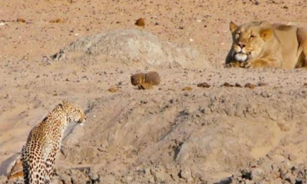 Μόλις βλέπει το λιοντάρι, η λεοπάρδαλη παραμένει παγωμένη για λίγες στιγμές, μέχρι που αποφασίζει να το βάλει στα πόδια. Όμως, το λιοντάρι δεν έχει πει την τελευταία του λέξη και αποφασίζει να πάρει τη λεοπάρδαλη στο κυνήγι.