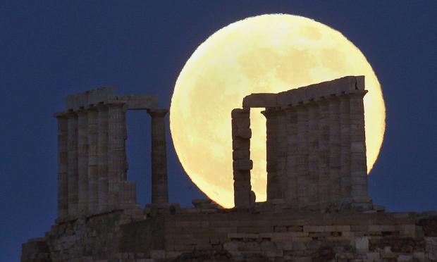 Το σκηνικό είναι μαγικό (την Παρασκευή 5 Ιουνίου 2020). Το Σούνιο, με το Ναό του Ποσειδώνα να διαγράφεται στον ορίζοντα, κάτω από το φως του ολόγιομου φεγγαριού.